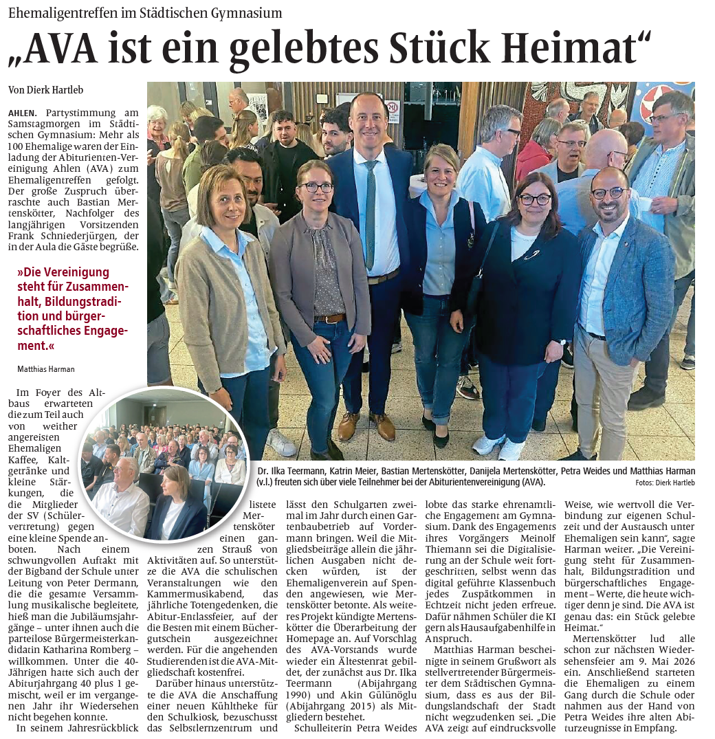Am 10. Mai 2025 um 11:00 Uhr ist es wieder soweit. Der Ehemaligentag 2025 am Städtischen Gymnasium findet in gewohnter Form in der Aula der Schule statt. Begleitet durch das Schulorchester und organsiert durch den im letzten Jahr neu gewählten AVA Vorstand befinden sich die Vorbereitungen in den letzten Zügen.