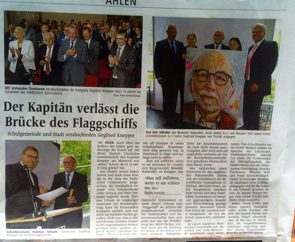 Nach einer stimmungsvollen Verabschiedungsfeier überreichten wir als Abschiedsgeschenk ein Ölgemälde mit dem Konterfei von Herrn Knepper. Dieses Gemälde wurde zu gleichen Teilen von der Stadt Ahlen, dem Förderverein und der AVA finanziert. Überreicht wurde das Kunstwerk vom Bürgermeister der Stadt Ahlen, Benedikt Ruhmöller, der Vorsitzenden des Fördervereins Frau Yerlin sowie dem Vorsitzenden der AVA-Ahlen, Frank Schniederjürgen.