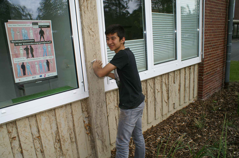 „Wir wollen mit diesen Reparaturen das Bild unserer Schule verbessern“, sagt der Vorsitzende der Abiturientenvereinigung Ahlen, Frank Schniederjürgen. Mit rund zwei Dutzend Helfern aus der Vereinigung, Schüler-, Eltern- und Lehrerschaft ging es an die Stahlsäulen der Pausenhalle rund um den Schulhof. Besonders freut Schniederjürgen sich über die Hilfe, die seiner Mannschaft von Schülerseite zu kommt. „Ganz toll, nach einem richtig langen Schultag stellen sie sich zu uns und helfen mit. Finde ich grandios.“ So kleben die Schüler eifrig Abdeckfolien. Dabei spielt der Wind zwar nicht mit, doch irgendwann siegt die Geduld. Freitag wird geschliffen und grundiert, Samstag gestrichen.